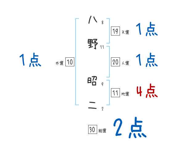 天運![]() | 八野昭二さんの天運は19画の1つ星!優れた才能を持ちますが、協調性が足りないことも。周りの人と協力する事を意識しましょう。 家系が持つ宿命的な運勢を表します。祖先から受け継いだ苗字ですので自分の力が及びません。家柄を象徴します。 |