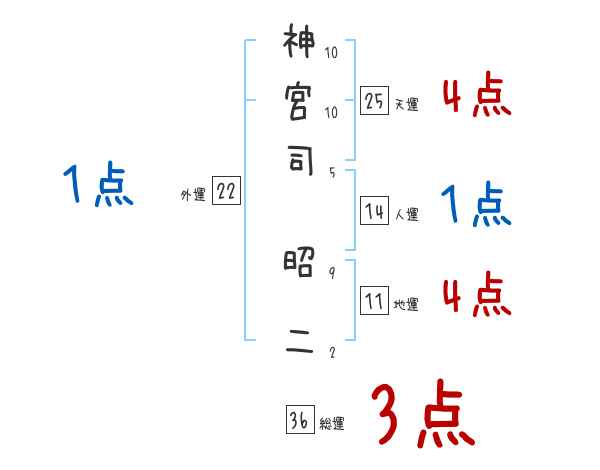 総運![]() | 神宮司昭二さんの総運は36画の3つ星!先見性が豊かです。多少神経質で苦労することも。 あなたの人生を表す1番重要な運勢です。生涯を通じて影響する総合運となり、主に50歳以降の晩年期に影響を及ぼします。 |