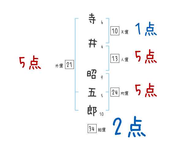 外運![]() | 寺井昭五郎さんの外運は21画の5つ星!統率力がある。独立し成功する。名誉を手に入れる。 生活面を象徴する運勢です。外部から受ける影響力を表し、結婚運、家庭運や職場、環境への順応性を表します。 |