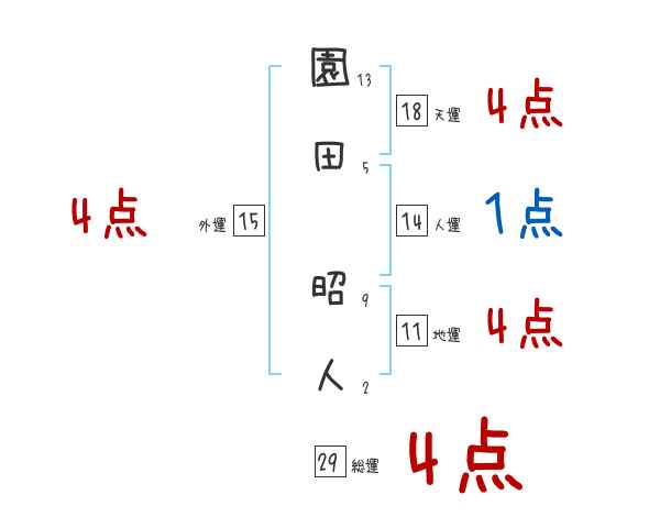 天運![]() | 園田昭人さんの天運は18画の4つ星!情熱的で剛気。忍耐力があり信頼される。 家系が持つ宿命的な運勢を表します。祖先から受け継いだ苗字ですので自分の力が及びません。家柄を象徴します。 |