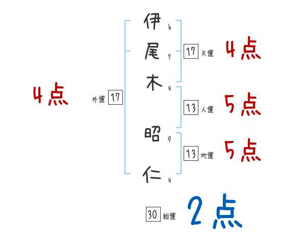 外運![]() | 伊尾木昭仁さんの外運は17画の4つ星!積極的な行動力。地位を気づき財産を手に入れる。純粋な心と直感力。 生活面を象徴する運勢です。外部から受ける影響力を表し、結婚運、家庭運や職場、環境への順応性を表します。 |