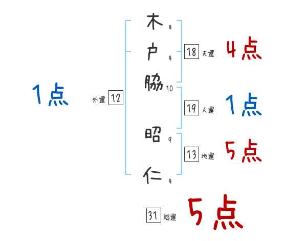 天運![]() | 木戸脇昭仁さんの天運は18画の4つ星!情熱的で剛気。忍耐力があり信頼される。 家系が持つ宿命的な運勢を表します。祖先から受け継いだ苗字ですので自分の力が及びません。家柄を象徴します。 |