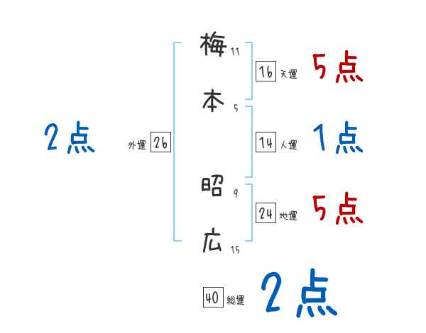 天運![]() | 梅本昭広さんの天運は16画の5つ星!人望が厚く大きく発展する。逆転成功が見える。 家系が持つ宿命的な運勢を表します。祖先から受け継いだ苗字ですので自分の力が及びません。家柄を象徴します。 |