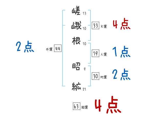 天運![]() | 嵯峨根昭絋さんの天運は33画の4つ星!権力志向でプライドが高い。勇気があり運を切り開き成功する。 家系が持つ宿命的な運勢を表します。祖先から受け継いだ苗字ですので自分の力が及びません。家柄を象徴します。 |