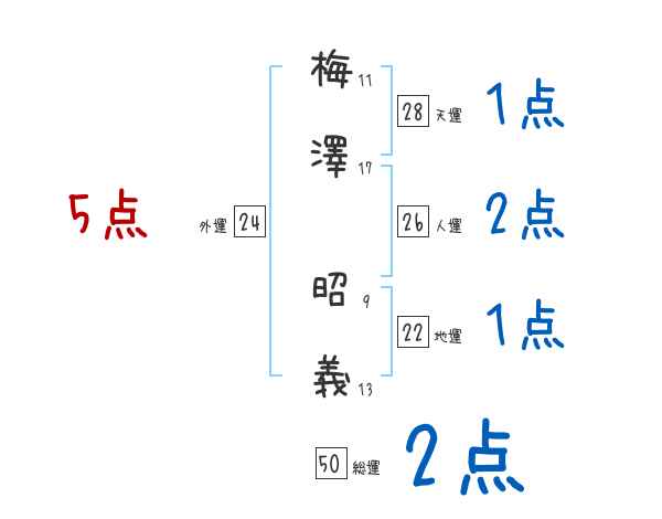 外運![]() | 梅澤昭義さんの外運は24画の5つ星!家庭運が良く順調な人生。金運にも恵まれる。 生活面を象徴する運勢です。外部から受ける影響力を表し、結婚運、家庭運や職場、環境への順応性を表します。 |