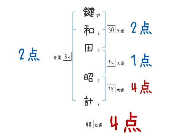 天運![]() | 鍵和田昭計さんの天運は30画の2つ星!浮き沈みの激しさに注意しましょう。 家系が持つ宿命的な運勢を表します。祖先から受け継いだ苗字ですので自分の力が及びません。家柄を象徴します。 |