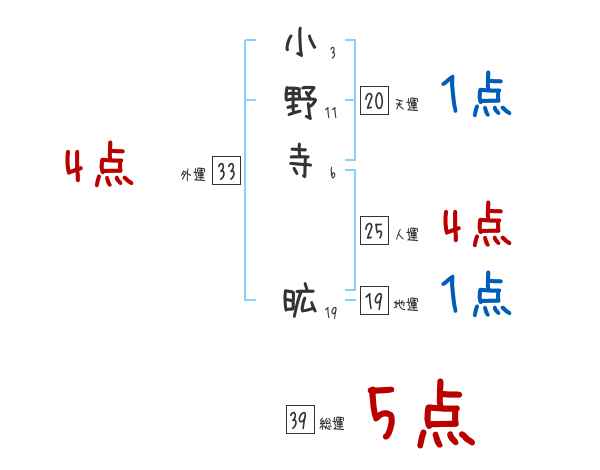 総運![]() | 小野寺昿さんの総運は39画の5つ星!社交性に優れ人望が厚い。人の上に立ち成功する。 あなたの人生を表す1番重要な運勢です。生涯を通じて影響する総合運となり、主に50歳以降の晩年期に影響を及ぼします。 |