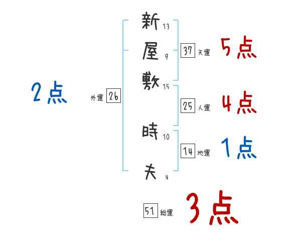 外運![]() | 新屋敷時夫さんの外運は26画の2つ星!波瀾万丈かも。信頼できる人を大事にしましょう。 生活面を象徴する運勢です。外部から受ける影響力を表し、結婚運、家庭運や職場、環境への順応性を表します。 |