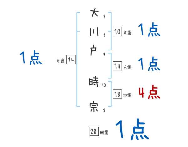 天運![]() | 大川戸時宗さんの天運は10画の1つ星!不安を感じやすい傾向。ストレスを抱えないように注意しましょう。 家系が持つ宿命的な運勢を表します。祖先から受け継いだ苗字ですので自分の力が及びません。家柄を象徴します。 |