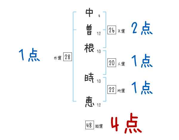 外運![]() | 中曽根時恵さんの外運は28画の1つ星!家庭環境に注意。スポーツで活躍できる能力があるかも。 生活面を象徴する運勢です。外部から受ける影響力を表し、結婚運、家庭運や職場、環境への順応性を表します。 |