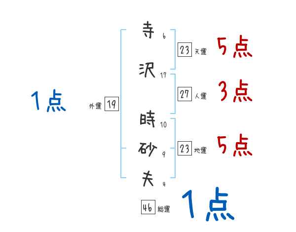 天運![]() | 寺沢時砂夫さんの天運は23画の5つ星!想像力に優れ活力がある。一代で成功し名誉を手に入れる。 家系が持つ宿命的な運勢を表します。祖先から受け継いだ苗字ですので自分の力が及びません。家柄を象徴します。 |