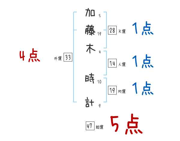 天運![]() | 加藤木時計さんの天運は28画の1つ星!家庭環境に注意。スポーツで活躍できる能力があるかも。 家系が持つ宿命的な運勢を表します。祖先から受け継いだ苗字ですので自分の力が及びません。家柄を象徴します。 |