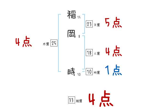 天運![]() | 稲岡時さんの天運は23画の5つ星!想像力に優れ活力がある。一代で成功し名誉を手に入れる。 家系が持つ宿命的な運勢を表します。祖先から受け継いだ苗字ですので自分の力が及びません。家柄を象徴します。 |