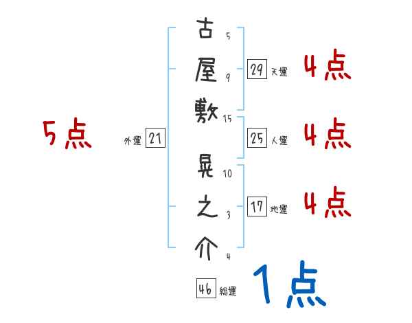 外運![]() | 古屋敷晃之介さんの外運は21画の5つ星!統率力がある。独立し成功する。名誉を手に入れる。 生活面を象徴する運勢です。外部から受ける影響力を表し、結婚運、家庭運や職場、環境への順応性を表します。 |