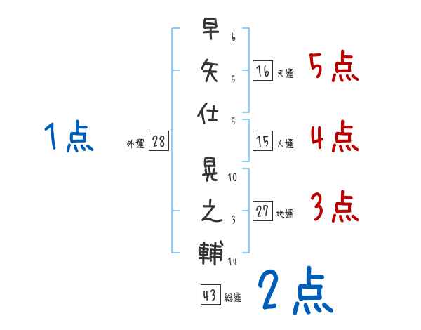 総運![]() | 早矢仕晃之輔さんの総運は43画の2つ星!頑固な性格で独立心が強いかも。やや非現実的で浪費に注意しましょう。 あなたの人生を表す1番重要な運勢です。生涯を通じて影響する総合運となり、主に50歳以降の晩年期に影響を及ぼします。 |