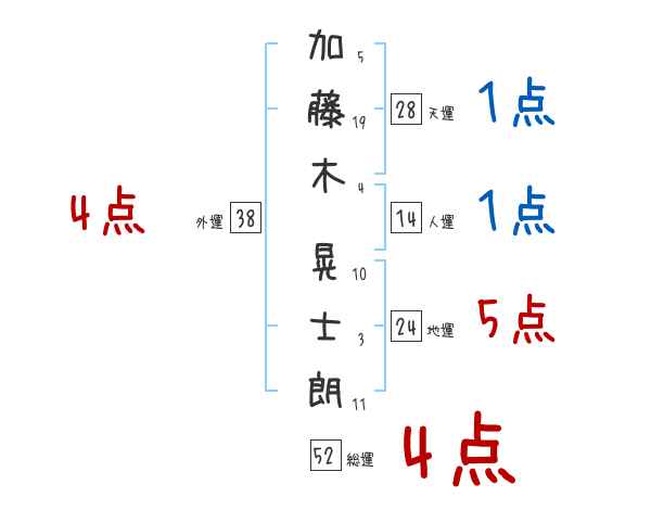 外運![]() | 加藤木晃士朗さんの外運は38画の4つ星!温厚な性格で技術的な才能を発揮する。職人的な仕事に向いている。 生活面を象徴する運勢です。外部から受ける影響力を表し、結婚運、家庭運や職場、環境への順応性を表します。 |