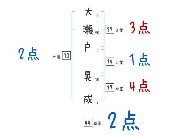 天運![]() | 大瀬戸晃成さんの天運は27画の3つ星!頭脳明晰だが強情で摩擦が多い傾向。孤立に注意。 家系が持つ宿命的な運勢を表します。祖先から受け継いだ苗字ですので自分の力が及びません。家柄を象徴します。 |