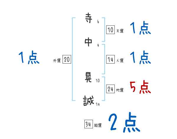 天運![]() | 寺中晃誠さんの天運は10画の1つ星!不安を感じやすい傾向。ストレスを抱えないように注意しましょう。 家系が持つ宿命的な運勢を表します。祖先から受け継いだ苗字ですので自分の力が及びません。家柄を象徴します。 |