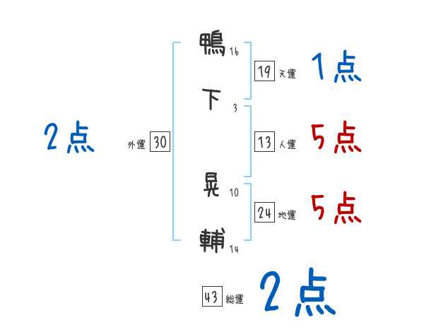 天運![]() | 鴨下晃輔さんの天運は19画の1つ星!優れた才能を持ちますが、協調性が足りないことも。周りの人と協力する事を意識しましょう。 家系が持つ宿命的な運勢を表します。祖先から受け継いだ苗字ですので自分の力が及びません。家柄を象徴します。 |