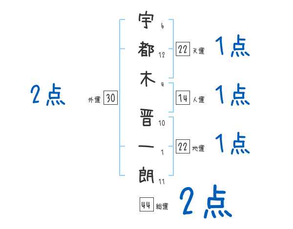 天運![]() | 宇都木晋一朗さんの天運は22画の1つ星!努力することが苦手ないっぽう手先が器用。芸術性にも優れる。 家系が持つ宿命的な運勢を表します。祖先から受け継いだ苗字ですので自分の力が及びません。家柄を象徴します。 |
