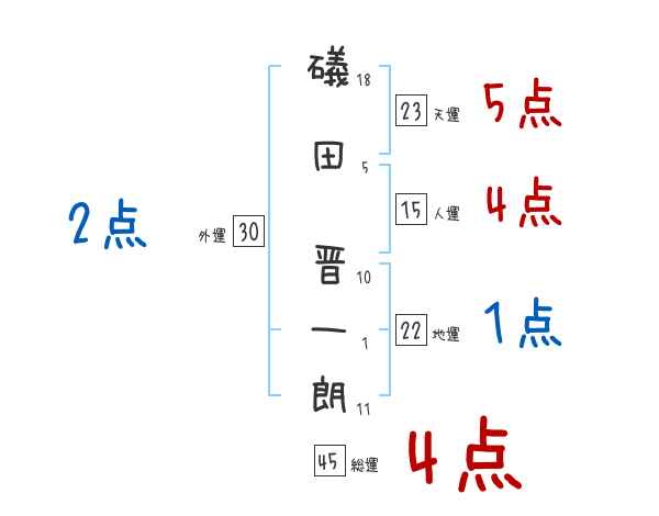 天運![]() | 礒田晋一朗さんの天運は23画の5つ星!想像力に優れ活力がある。一代で成功し名誉を手に入れる。 家系が持つ宿命的な運勢を表します。祖先から受け継いだ苗字ですので自分の力が及びません。家柄を象徴します。 |