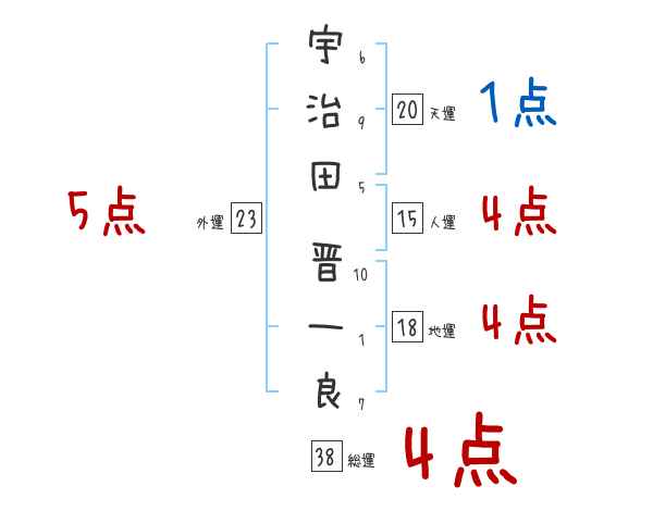 外運![]() | 宇治田晋一良さんの外運は23画の5つ星!想像力に優れ活力がある。一代で成功し名誉を手に入れる。 生活面を象徴する運勢です。外部から受ける影響力を表し、結婚運、家庭運や職場、環境への順応性を表します。 |