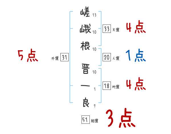 天運![]() | 嵯峨根晋一良さんの天運は33画の4つ星!権力志向でプライドが高い。勇気があり運を切り開き成功する。 家系が持つ宿命的な運勢を表します。祖先から受け継いだ苗字ですので自分の力が及びません。家柄を象徴します。 |