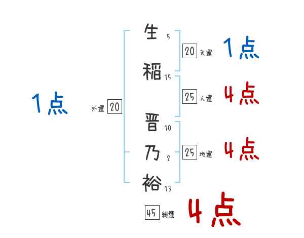 人運![]() | 生稲晋乃裕さんの人運は25画の4つ星!個性があり才能があふれる。強運の持ち主で発展する。 性格や才能などを表す2番目に重要な運勢です。人間関係や協調性、社会的な成功に影響します。主に20歳から50歳ぐらいまでの中年期の運勢を表します。 |