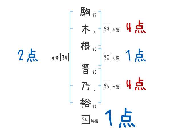 天運![]() | 駒木根晋乃裕さんの天運は29画の4つ星!完全主義で才能がある。厳格な心の持ち主。 家系が持つ宿命的な運勢を表します。祖先から受け継いだ苗字ですので自分の力が及びません。家柄を象徴します。 |