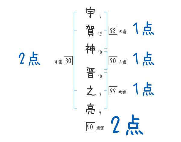 | 人運  | 宇賀神晋之亮さんの人運は20画の1つ星!社交が苦手。人とは違った才能があり波乱万丈な人生かも。性格や才能などを表す2番目に重要な運勢です。人間関係や協調性、社会的な成功に影響します。主に20歳から50歳ぐらいまでの中年期の運勢を表します。 |
