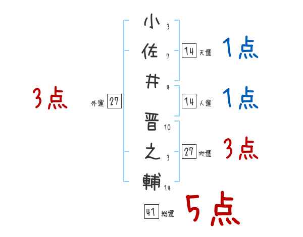 天運![]() | 小佐井晋之輔さんの天運は14画の1つ星!人に対して優しいがストレスを溜め込みがち。人間関係のトラブルを避けるよう気をつけましょう。 家系が持つ宿命的な運勢を表します。祖先から受け継いだ苗字ですので自分の力が及びません。家柄を象徴します。 |