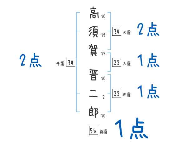 人運![]() | 高須賀晋二郎さんの人運は22画の1つ星!努力することが苦手ないっぽう手先が器用。芸術性にも優れる。 性格や才能などを表す2番目に重要な運勢です。人間関係や協調性、社会的な成功に影響します。主に20歳から50歳ぐらいまでの中年期の運勢を表します。 |