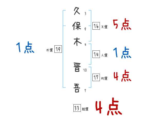 外運![]() | 久保木晋吾さんの外運は19画の1つ星!優れた才能を持ちますが、協調性が足りないことも。周りの人と協力する事を意識しましょう。 生活面を象徴する運勢です。外部から受ける影響力を表し、結婚運、家庭運や職場、環境への順応性を表します。 |