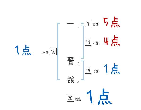 外運![]() | 一晋哉さんの外運は10画の1つ星!不安を感じやすい傾向。ストレスを抱えないように注意しましょう。 生活面を象徴する運勢です。外部から受ける影響力を表し、結婚運、家庭運や職場、環境への順応性を表します。 |