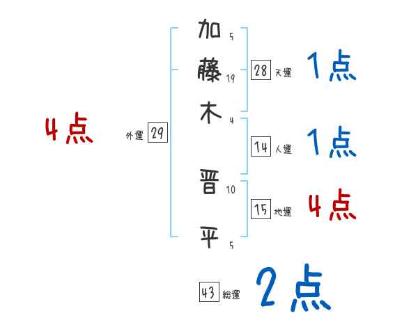 外運![]() | 加藤木晋平さんの外運は29画の4つ星!完全主義で才能がある。厳格な心の持ち主。 生活面を象徴する運勢です。外部から受ける影響力を表し、結婚運、家庭運や職場、環境への順応性を表します。 |