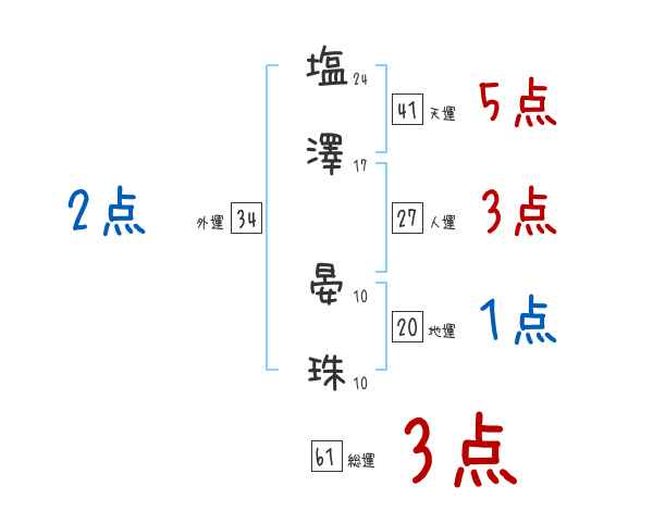 天運![]() | 塩澤晏珠さんの天運は41画の5つ星!大志を抱き、目標に向かって実力を発揮し達成する。温和な性格。 家系が持つ宿命的な運勢を表します。祖先から受け継いだ苗字ですので自分の力が及びません。家柄を象徴します。 |