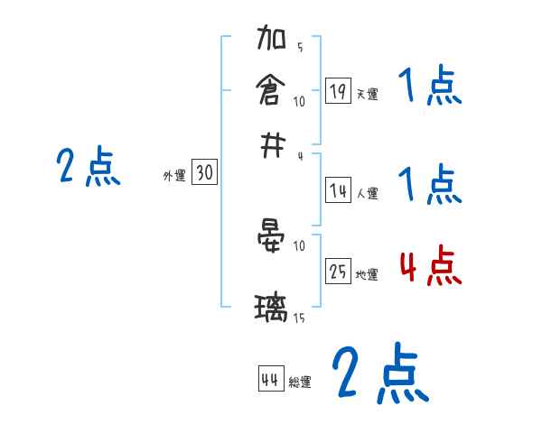 総運![]() | 加倉井晏璃さんの総運は44画の2つ星!誠実で慎重な性格。物事を考えすぎないように注意しましょう。 あなたの人生を表す1番重要な運勢です。生涯を通じて影響する総合運となり、主に50歳以降の晩年期に影響を及ぼします。 |
