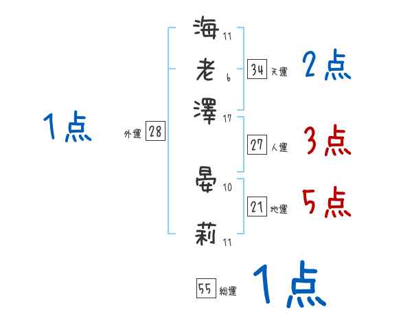 総運![]() | 海老澤晏莉さんの総運は55画の1つ星!欲張りな性格で軽率な行動に注意しましょう。病気に気をつけて。 あなたの人生を表す1番重要な運勢です。生涯を通じて影響する総合運となり、主に50歳以降の晩年期に影響を及ぼします。 |