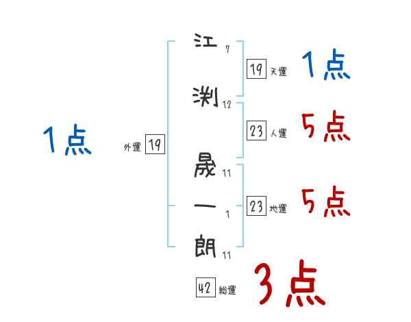 天運![]() | 江渕晟一朗さんの天運は19画の1つ星!優れた才能を持ちますが、協調性が足りないことも。周りの人と協力する事を意識しましょう。 家系が持つ宿命的な運勢を表します。祖先から受け継いだ苗字ですので自分の力が及びません。家柄を象徴します。 |