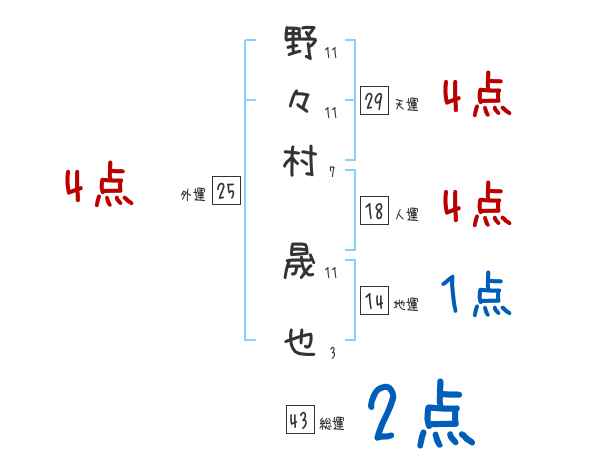 天運![]() | 野々村晟也さんの天運は29画の4つ星!完全主義で才能がある。厳格な心の持ち主。 家系が持つ宿命的な運勢を表します。祖先から受け継いだ苗字ですので自分の力が及びません。家柄を象徴します。 |