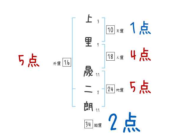 天運![]() | 上里晟二朗さんの天運は10画の1つ星!不安を感じやすい傾向。ストレスを抱えないように注意しましょう。 家系が持つ宿命的な運勢を表します。祖先から受け継いだ苗字ですので自分の力が及びません。家柄を象徴します。 |