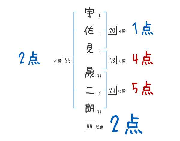 総運![]() | 宇佐見晟二朗さんの総運は44画の2つ星!誠実で慎重な性格。物事を考えすぎないように注意しましょう。 あなたの人生を表す1番重要な運勢です。生涯を通じて影響する総合運となり、主に50歳以降の晩年期に影響を及ぼします。 |