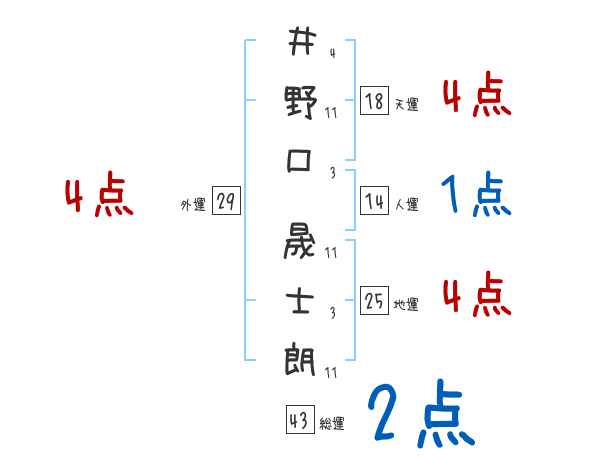 天運![]() | 井野口晟士朗さんの天運は18画の4つ星!情熱的で剛気。忍耐力があり信頼される。 家系が持つ宿命的な運勢を表します。祖先から受け継いだ苗字ですので自分の力が及びません。家柄を象徴します。 |