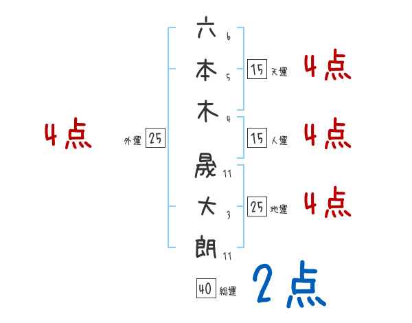 総運![]() | 六本木晟大朗さんの総運は40画の2つ星!自信過剰で物事に固執するためトラブルに注意。 あなたの人生を表す1番重要な運勢です。生涯を通じて影響する総合運となり、主に50歳以降の晩年期に影響を及ぼします。 |