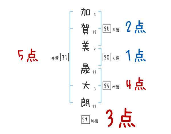 総運![]() | 加賀美晟大朗さんの総運は51画の3つ星!変化が激しく、危険に注意。堅実な性格。 あなたの人生を表す1番重要な運勢です。生涯を通じて影響する総合運となり、主に50歳以降の晩年期に影響を及ぼします。 |