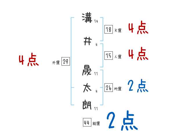 総運![]() | 溝井晟太朗さんの総運は44画の2つ星!誠実で慎重な性格。物事を考えすぎないように注意しましょう。 あなたの人生を表す1番重要な運勢です。生涯を通じて影響する総合運となり、主に50歳以降の晩年期に影響を及ぼします。 |