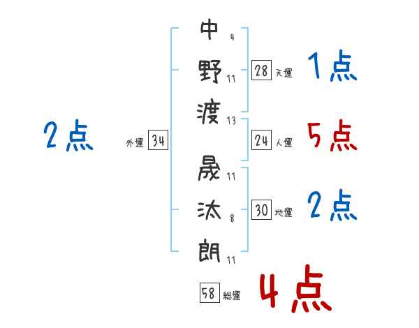 総運![]() | 中野渡晟汰朗さんの総運は58画の4つ星!安定した生活。大器晩成タイプ。 あなたの人生を表す1番重要な運勢です。生涯を通じて影響する総合運となり、主に50歳以降の晩年期に影響を及ぼします。 |