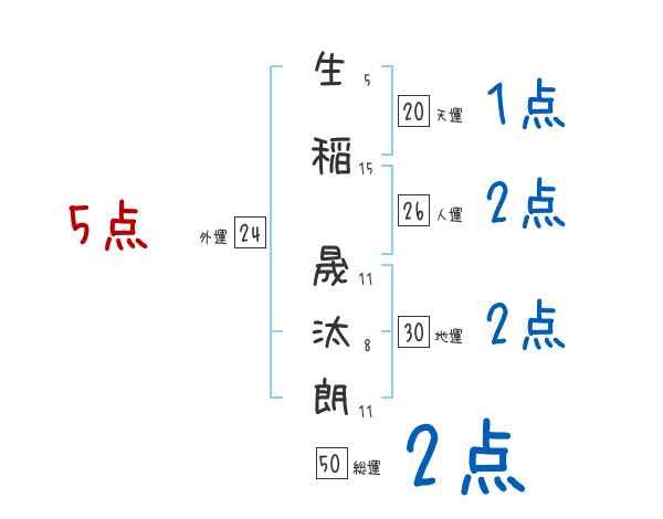 外運![]() | 生稲晟汰朗さんの外運は24画の5つ星!家庭運が良く順調な人生。金運にも恵まれる。 生活面を象徴する運勢です。外部から受ける影響力を表し、結婚運、家庭運や職場、環境への順応性を表します。 |
