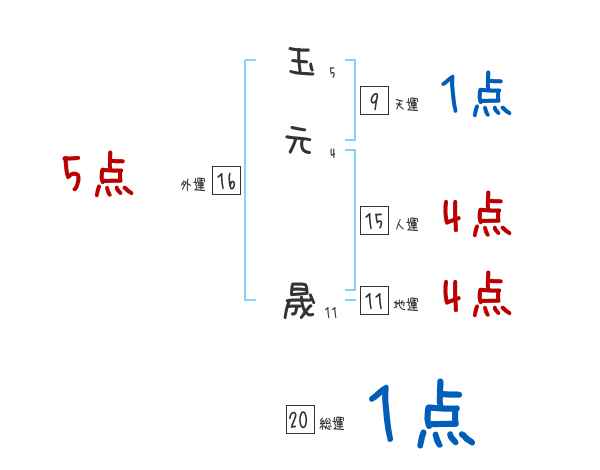 外運![]() | 玉元晟さんの外運は16画の5つ星!人望が厚く大きく発展する。逆転成功が見える。 生活面を象徴する運勢です。外部から受ける影響力を表し、結婚運、家庭運や職場、環境への順応性を表します。 |