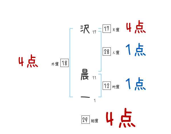 天運![]() | 沢晨一さんの天運は17画の4つ星!積極的な行動力。地位を気づき財産を手に入れる。純粋な心と直感力。 家系が持つ宿命的な運勢を表します。祖先から受け継いだ苗字ですので自分の力が及びません。家柄を象徴します。 |